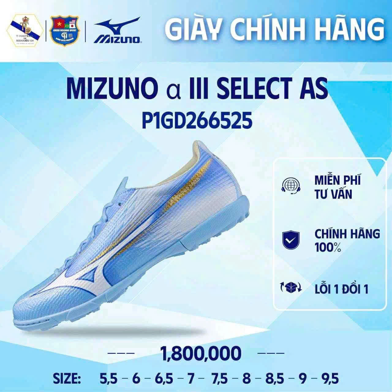 Giày đá bóng mizuno anpha 3 select as Trọng lượng siêu nhẹ Thiết kế theo triết lý giày tốc độ của dòng Alpha giúp tăng tốc nhanh, di chuyển linh hoạt và giảm mỏi chân khi thi đấu lâu. Upper ôm chân – cảm giác bóng tốt Phần thân giày mềm, ôm chân vừa vặn giúp kiểm soát bóng chính xác, rê dắt và xử lý bóng tự tin hơn. Đế AS chuyên sân cỏ nhân tạo