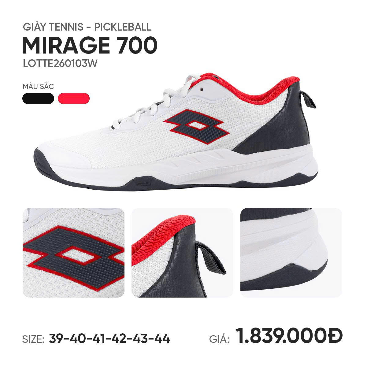 Giày Pickleball tennis nam chính hãng Lotto Ý Mirage 700 là mẫu giày court đa năng của thương hiệu Lotto (Ý), thiết kế dùng cho tennis – pickleball – cầu lông sân cứng, hướng tới người chơi phong trào đến bán chuyên cần độ ổn định và thoải mái. Trọng lượng khoảng 300–305g, đế All Court phù hợp nhiều mặt sân, dễ dùng cho người chơi pickleball tại Việt Nam.
