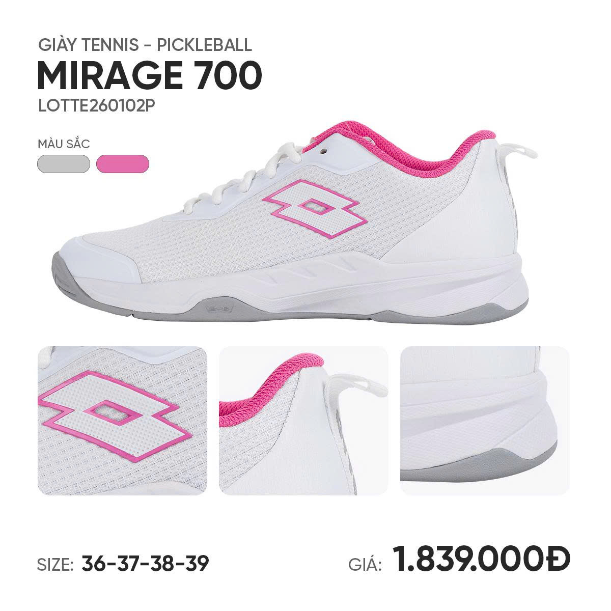 Giày Pickleball tennis nữ chính hãng Lotto Ý Mirage 700 là mẫu giày court đa năng của thương hiệu Lotto (Ý), thiết kế dùng cho tennis – pickleball – cầu lông sân cứng, hướng tới người chơi phong trào đến bán chuyên cần độ ổn định và thoải mái. Trọng lượng khoảng 200–205g, đế All Court phù hợp nhiều mặt sân, dễ dùng cho người chơi pickleball tại Việt Nam.